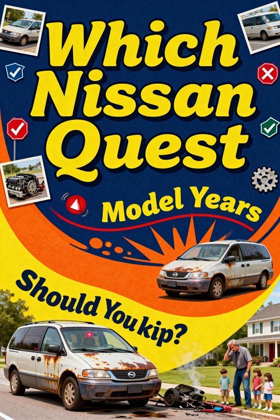You’ll want to steer clear of the 2004, 2007, 2011, and 2012 Nissan Quest models, which are notorious for transmission failures, electrical malfunctions, and engine problems. The 2004 model alone accumulated over 700 complaints, while the 2007 version suffers from dangerous transmission hesitation and rough shifting. These problematic years represent the worst of the third generation’s reliability issues. Instead, you should focus on first-generation models (1995–1997) or fourth-generation years (2013–2016), which demonstrate considerably better track records and fewer owner complaints.