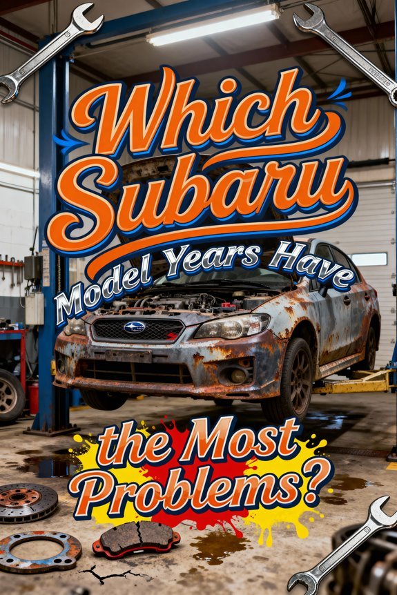 When evaluating used Subaru models, you’ll want to steer clear of several high-risk model years that demonstrate documented reliability failures across critical systems. The 2013 Outback exhibits multiple safety recalls and significant mechanical deficiencies. The 2008-2013 Impreza presents transmission failures, brake line corrosion, and electrical malfunctions. The 2019 Ascent is notorious for catastrophic transmission problems, including erratic shifting and power loss. When applying used Subaru tips, avoid older models equipped with EJ series engines due to prevalent head gasket leaks and timing belt failures. Early CVT-equipped vehicles face increased transmission failure rates and excessive oil consumption. Vehicles with CVTs may also experience hesitation, shuddering, or complete transmission failure. The Tribeca’s 2006 model year should be avoided due to industry-wide quality issues, while 2009 and 2010 models are particularly problematic with engine oil seepage, shaking, and transmission failures. Similar to certain problematic Toyota Highlander years like 2003 and 2008, some Subaru models exhibit engine issues and oil consumption problems that require costly repairs. You should prioritize reviewing maintenance history and verify all recalls have been addressed. Later model features often incorporate engineering improvements that resolve earlier deficiencies.